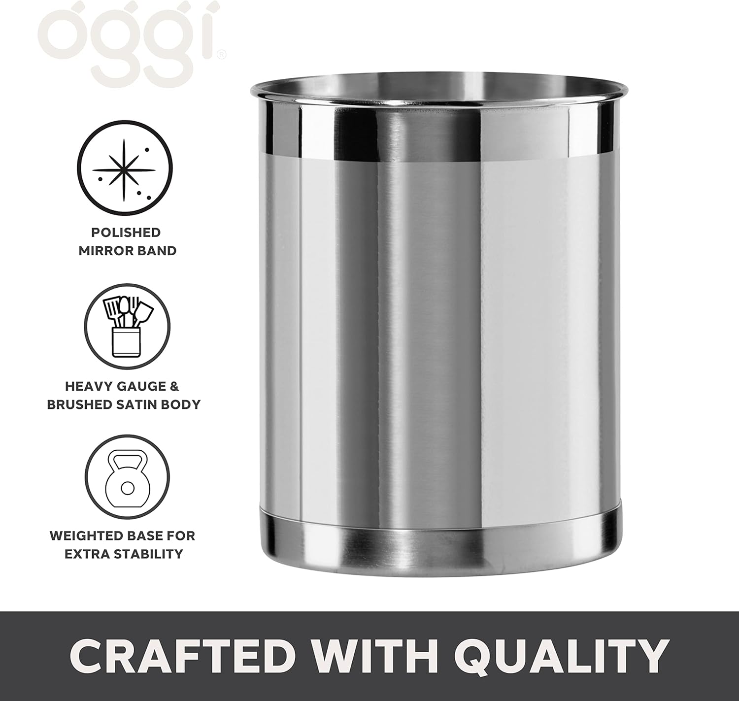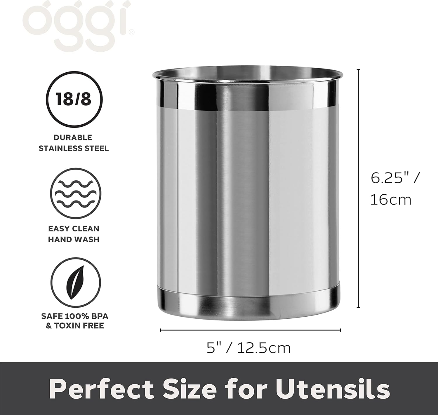Oggi Stainless Steel Utensil Holder - 5" Diameter, Utensil Caddy, Weighted Base for Stability - Larger-Sized Utensil Crock and Countertop Utensil Organizer, Stainless Steel