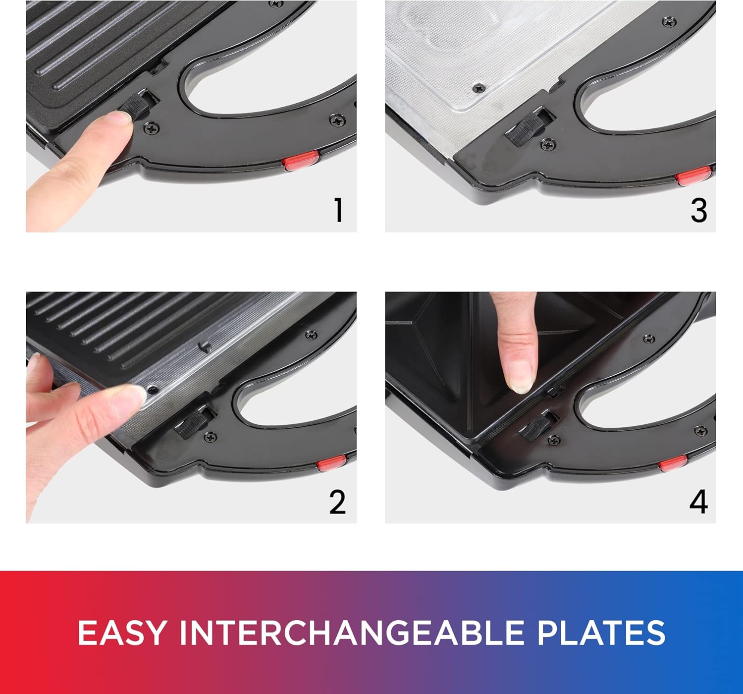 - Included Components : 1 set griddle plates, 1 set grill plates, 1 set sandwich maker plates, 1 set waffle maker plates