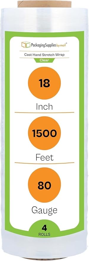 PSBM Stretch Wrap, 4 Pack, 18 Inch x 1500 Feet, 80 Gauge, Clear Plastic Cling, Cast Hand Stretch Film Rolls for Packaging Moving Packing