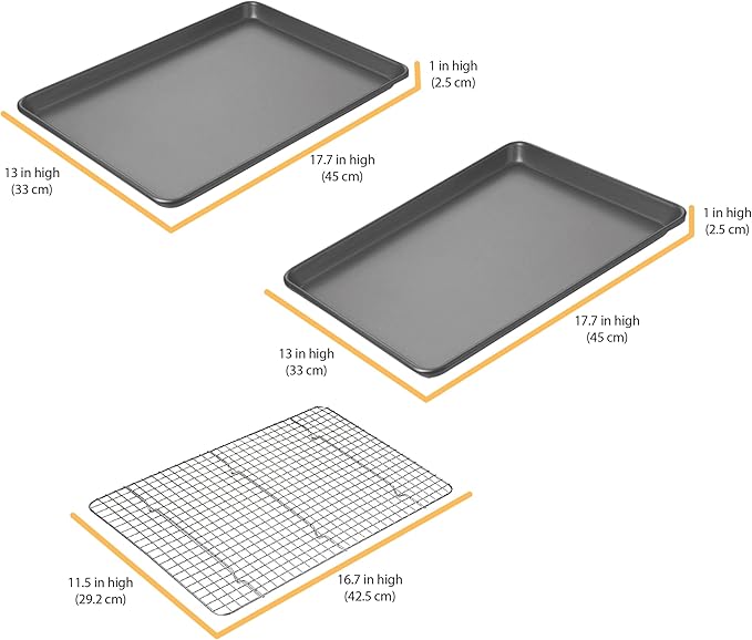 - THE PERFECT SIZED BAKING SHEET SET: The sheets feature a wire rod reinforced rim to prevent any warping. The 2 baking sheet pans measure 17.75" x 13" x 1"; inner dimensions are 17" x 12.25"x 1". The cooling rack measures 16.75" x 11.5"