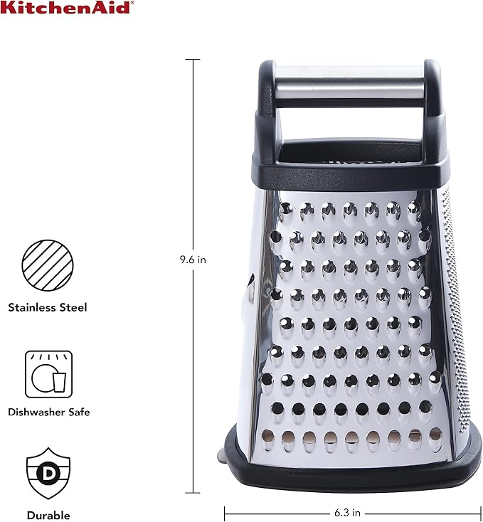 KitchenAid Gourmet 4-Sided Stainless Steel Box Grater for Fine, Medium and Coarse Grate, and Slicing, Detachable 3 Cup Storage Container and Measurment Markings, Dishwasher Safe, 10 inches tall, Black