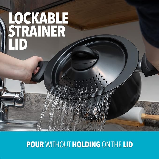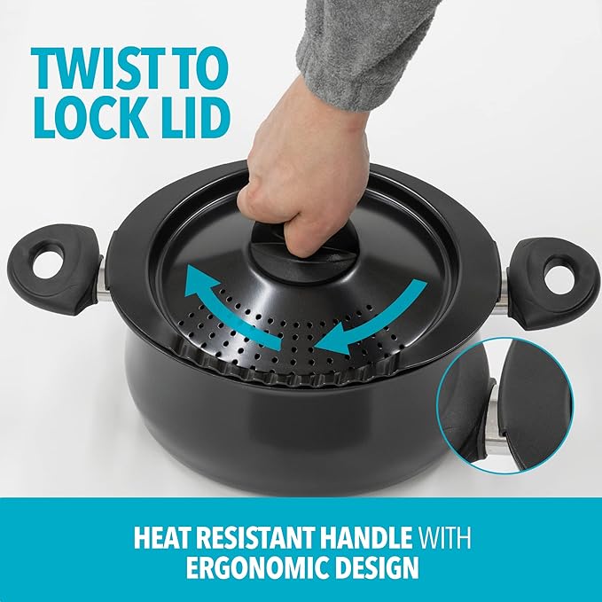 - STRAINER LID: Pot's lid twists and locks into place securely and features integrated straining holes for additional safety and convenience when draining excess water out of the pot