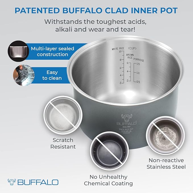 - Only Patented Buffalo Clad unibody and Multi-layer sealed construction to give you even heating and superior heating conduction for great-tasting rice. Great for white rice/ brown rice/congee/ keep warm