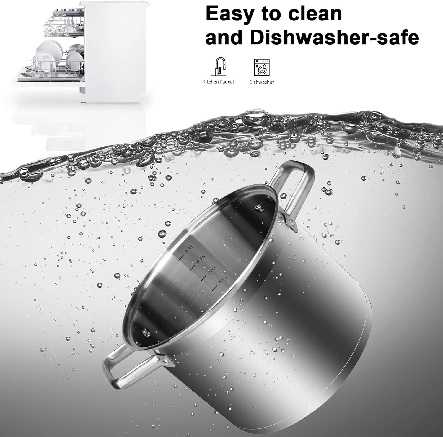 - HIGH QUALITY MATERIAL: This 8.6 quarts stockpot is manufactured with 304 food grade stainless steel. Heavy gauge impacted-bonded aluminum encapsulated bottom of the cooking set provides a quick, even and energy-efficient heating