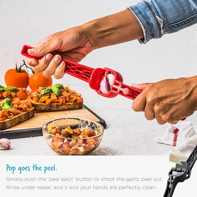 - EJECT AND CLEAN | Dispose of the peels with the press of a button! Straight from our garlic crusher and into the bin. Don’t worry about cleaning as Garject Lite scrapes itself off. All it will need is a rinse under the tap, but it's also dishwasher safe