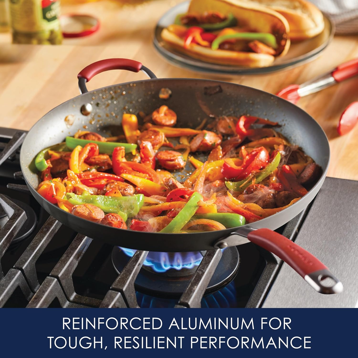 Rachael Ray 87631-T Cucina Hard Anodized Nonstick Skillet with Helper Handle, 14 Inch Frying Pan, Gray/Red