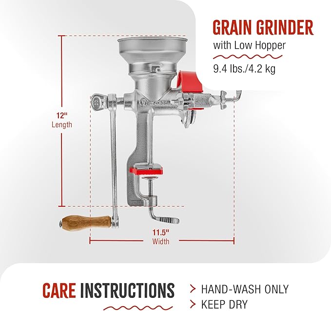 - EASY TO USE: This hand grinder can clamp onto most tables 1/2"–2" thick and is available with a low or high hopper. It comes with a non-slip rubber protector that protects your surfaces and prevents the grain grinder from slipping during heavy work.
