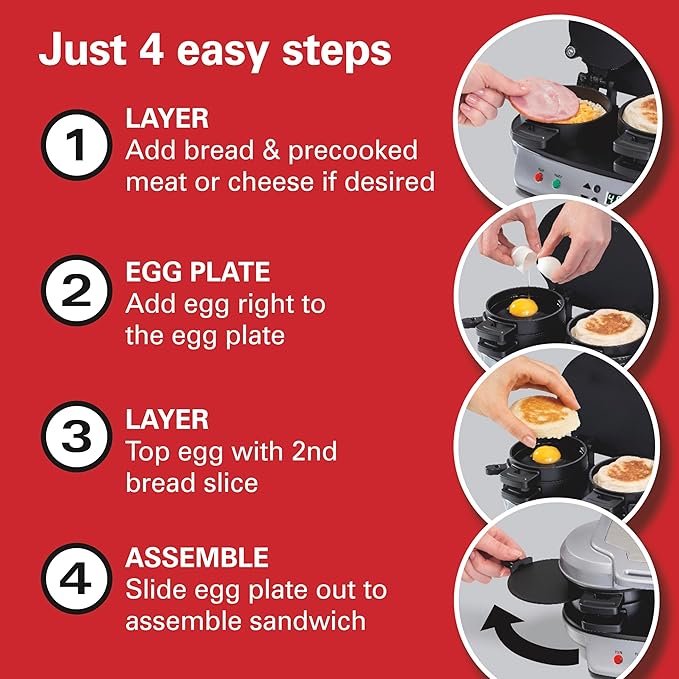 - JUST 4 EASY STEPS: Building your breakfast sandwich comes together in just a few easy steps with this breakfast maker — and you don't even need to leave your house.