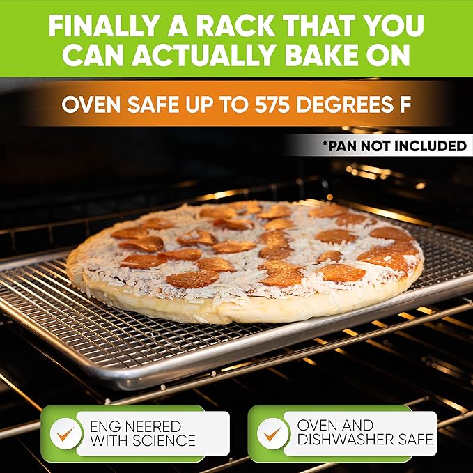 - Finally A Rack That You Can Actually Bake On - Oven Safe up to 575 degrees F. Rack fits perfectly in Spring Chef's Aluminum Half Sheet Baking Pan as well as other Half Sheet Baking Pans and Cookie Sheets with interior dimensions of 12" x 17.1" or more (as shown in image - pan not included). Exact dimensions 11.81 x 17.05 inches.