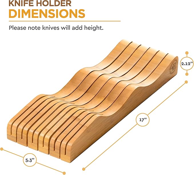 - HIGH QUALITY BAMBOO: This unique drawer knife holder is made of sturdy bamboo wood, which doesn’t ruin your knives’ blades.