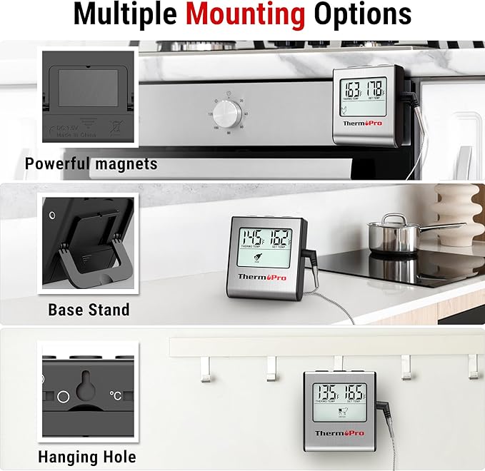 - Convenient storage: Digital food thermometer, features a magnetic back to allow you to easily attach to refrigerator or any metal surface; a hanging hole for your kitchen hooks or a lanyard;tabletop for any layout situation