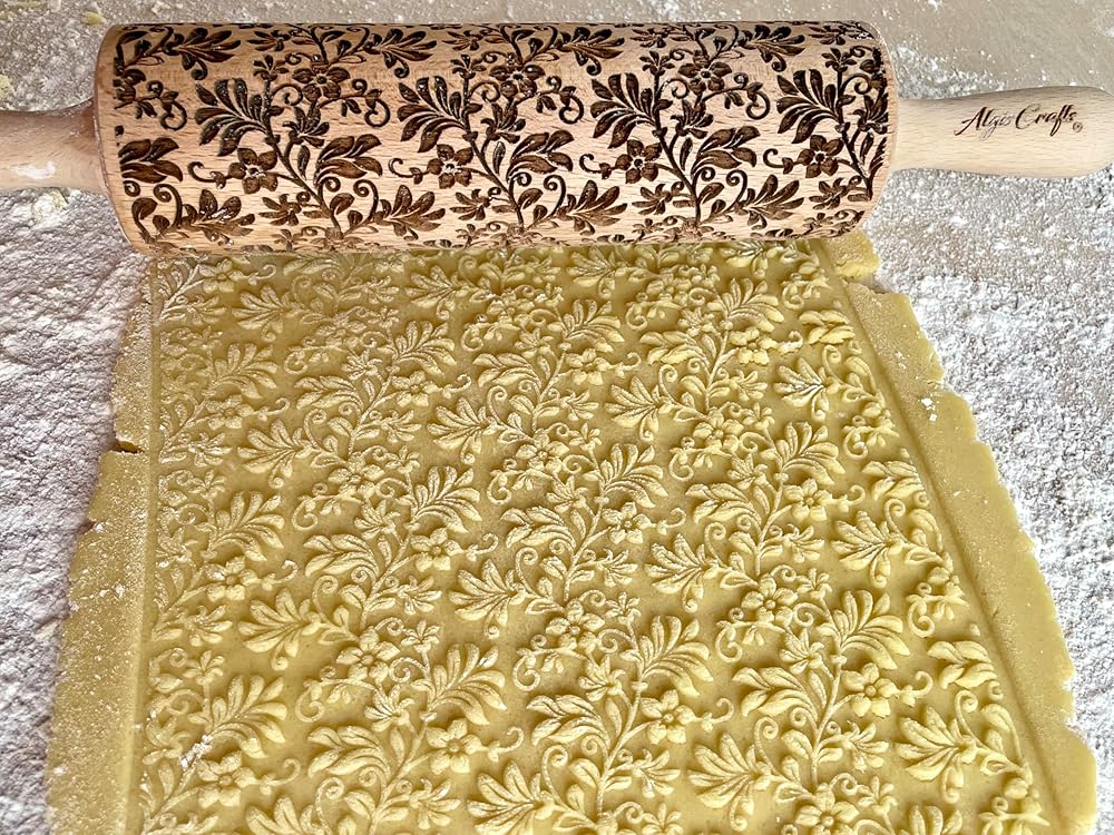 Embossing Rolling Pin FLORAL WREATH with Flowers Pattern. Dough and Clay Roller for Embossed Cookies and Pottery. Cookie and Ceramic Stamp. Backing Gifts for Women by Algis Crafts