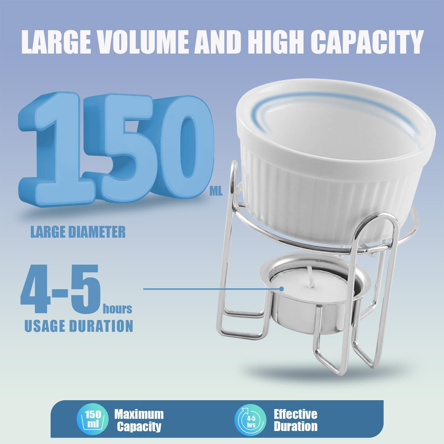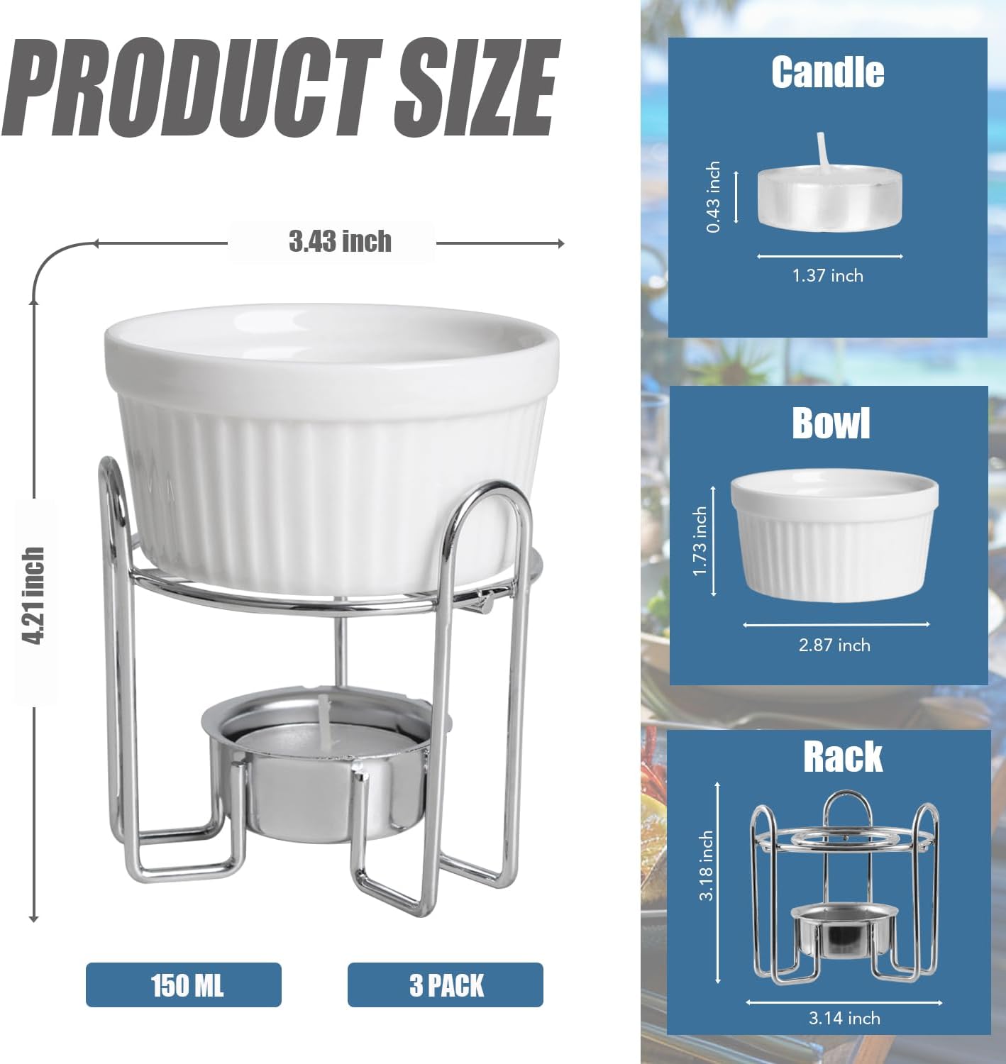 - BIGGER CAPACITY - Our butter warmers have an adequate capacity of approximately 5.1 oz/ 150 ml, large enough to hold a decent amount of anything, making them a nice portion for lobster crab. The candles and metal stands have the ideal dimensions, about 1.37 x 0.43 inches for the candles, and about 3.14 x 3.18 inches for the stands, offering a practical and compact design, durable for long-term use. Fancy enough to use on any occasion!
