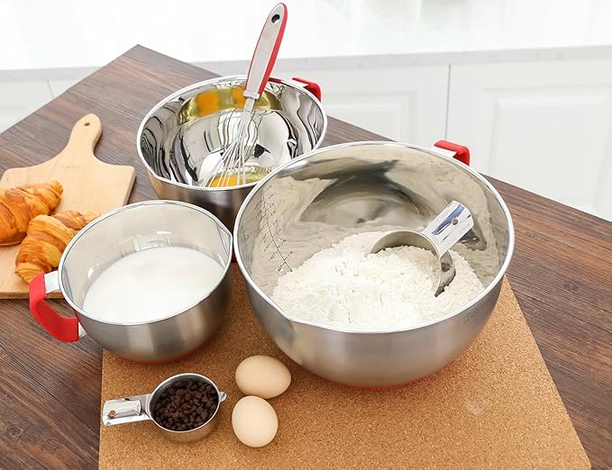 - EASY TO USE: The silicone handles make the bowls easier to lift and hold down on a surface. The pour spout allows for easier pouring. The non-slip silicone bottom ensures the bowls will stay in place when you mixing