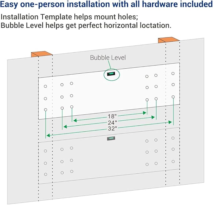 - Suitable for wood stud spacing of 18", 24" or 32". Can NOT be mounted to metal wall.