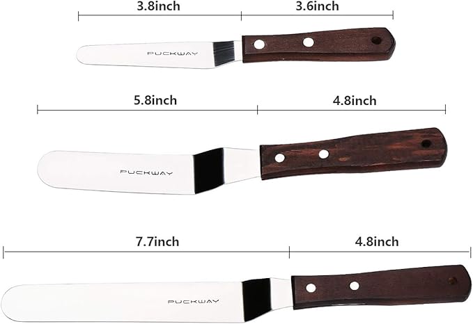 - Three Professional Cake Decorating Spatulas: Our offset spatula set comes in three different sizes: 4" - 6" - 8" blade (total 7.5''-10.8''-12.8''), This is your best choice to decorate a cake perfectly.
