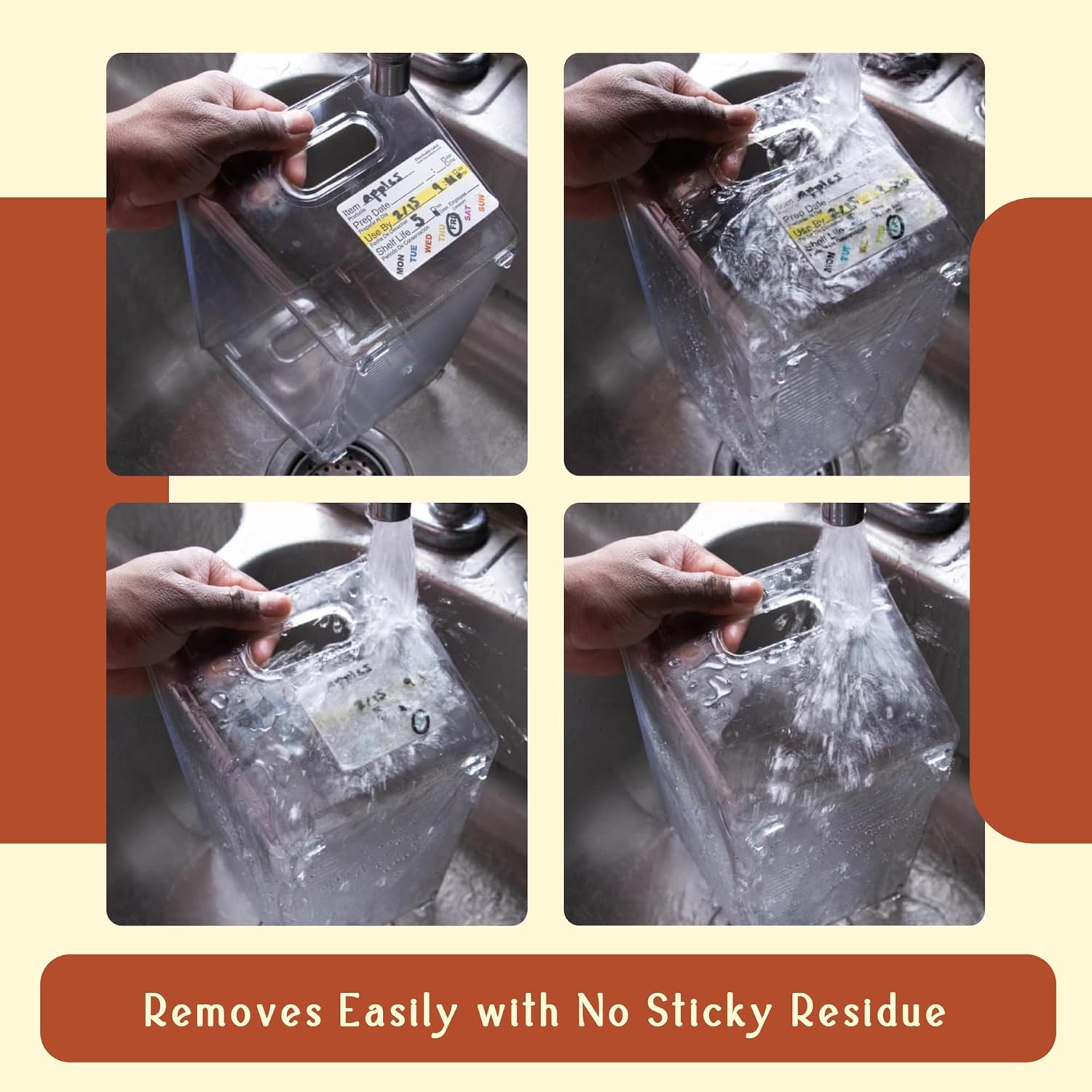 - COMPLETELY DISSOLVABLE: These freezer labels for food containers dissolve entirely in water, either in the dishwasher or under running water, leaving no sticky residue. Effortlessly remove them after use—ideal for labeling food containers or freezer storage.