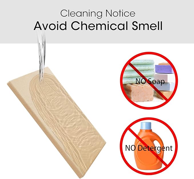 - [Easy to Clean] Use scraper to remove excess food, when the stone has cooled down, hand wash with warm water or scrubbing with a brush if accessories. [Warning] Never use soap or detergent to clean the stone! Never season cordierite stone with oil or grease!