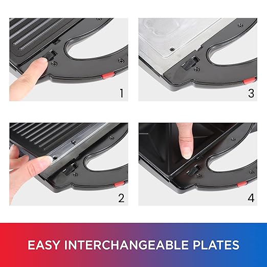 - 4 IN 1 COUNTERTOP COOKING - The appliance comes with four interchangeable non-stick cast iron plates, transforming it into a grilled cheese sandwich maker, griddle, panini press, or waffle iron. This feature offers endless creative cooking possibilities, making it a versatile addition to any kitchen.