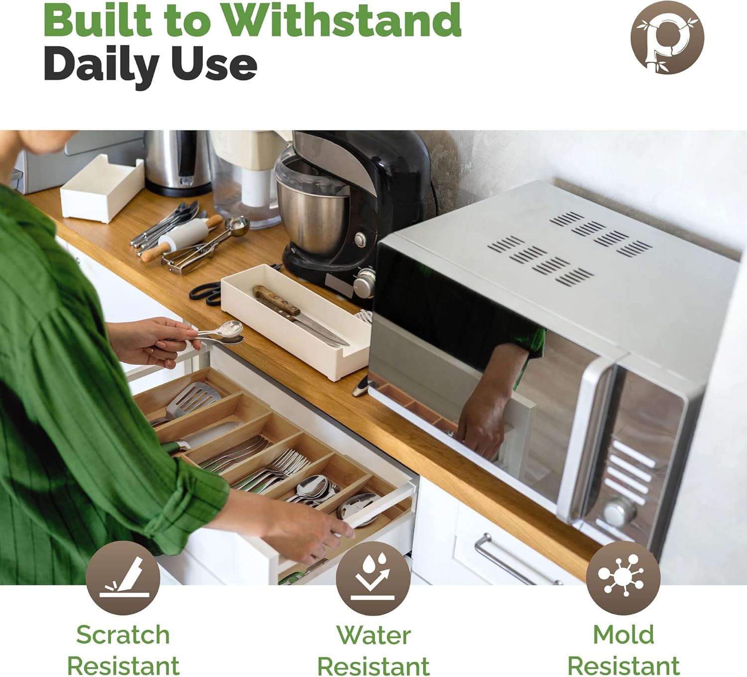 - SAFE FOR YOU & YOUR FAMILY: Our silverware holder is made up of the 100% highest quality Moso bamboo. We don't use the toxic MDF bottom like other bamboo silverware organizers - that means our flatware holder is safe for you and your family. 100% bamboo offers naturally water-resistant properties.