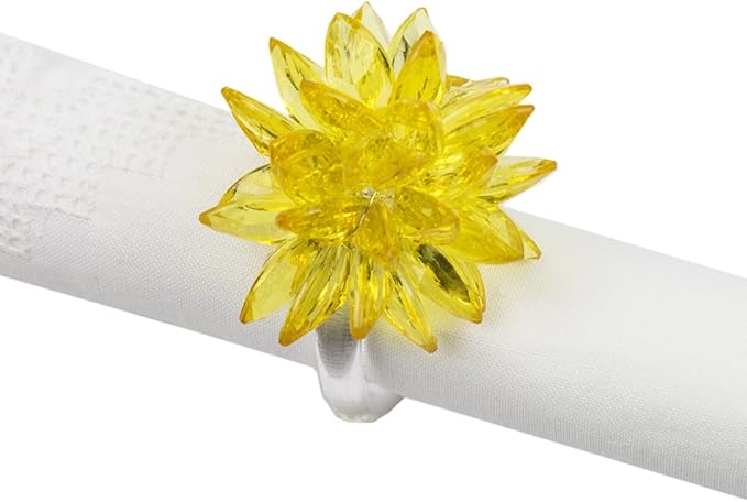 - These Crystal Flower napkin rings top elegant tablescapes with romantic charm. Features a cluster of acrylic petals in a floral design adorns a simple circle ring, exuding romantic flair in a choice of feminine hues.