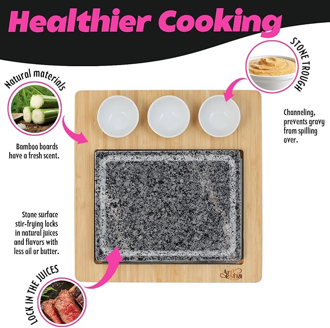 - COMPLETE COOKING STONE FOR STEAK SET - Artestia high-quality complete indoor grilling set that includes a sturdy serving bamboo tray, 2 good-sized heavy natural granite grill blocks, 3 side dish bowls, which all fit into sunken compartments in the bamboo wood tray. Everything can go into your dishwasher except for the bamboo tray and stones, the lava stones need to be just wiped off with a damp cloth