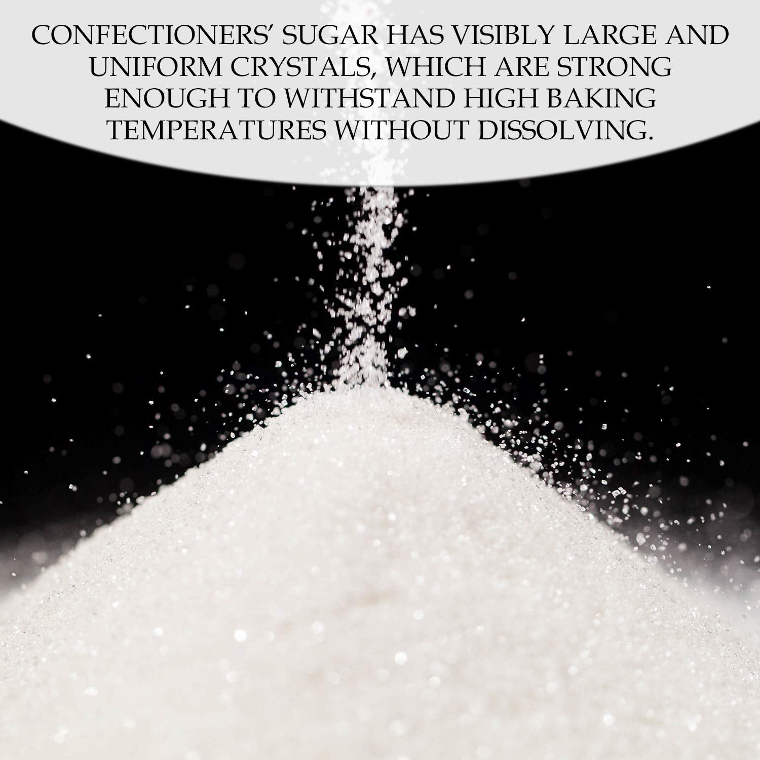- TYPE: Confectioners sugar is a type of powdered sugar with a visibly larger, uniform particle size. Granulated sugar is also stronger and more heat resistant compared to other sugars, making it ideal for bakers.