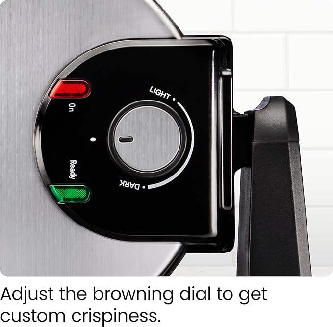 - ADJUSTABLE TIMER: Adjustable browning control dial gives you flexibility to create waffles just as you like them. Set the timer to a lower setting for more fluffy waffles and a higher setting for a darker, crispier waffle.
