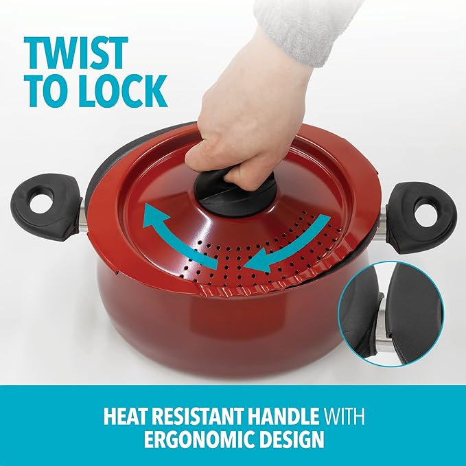 - LOCKABLE STRAINER LID: Twisting and locking securely in place, the pot strainer lid features integrated straining holes for a safer and more convenient way to drain excess water from your large pot without your food spilling out of the pot.