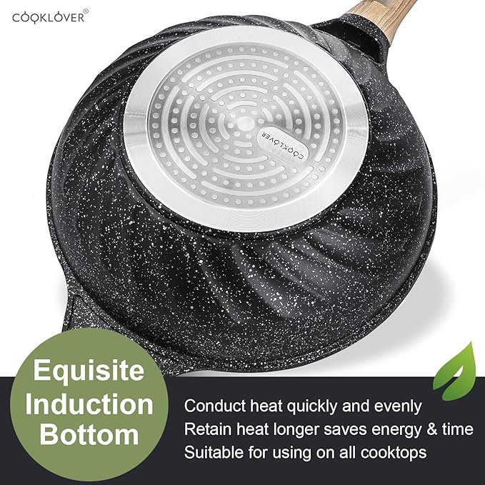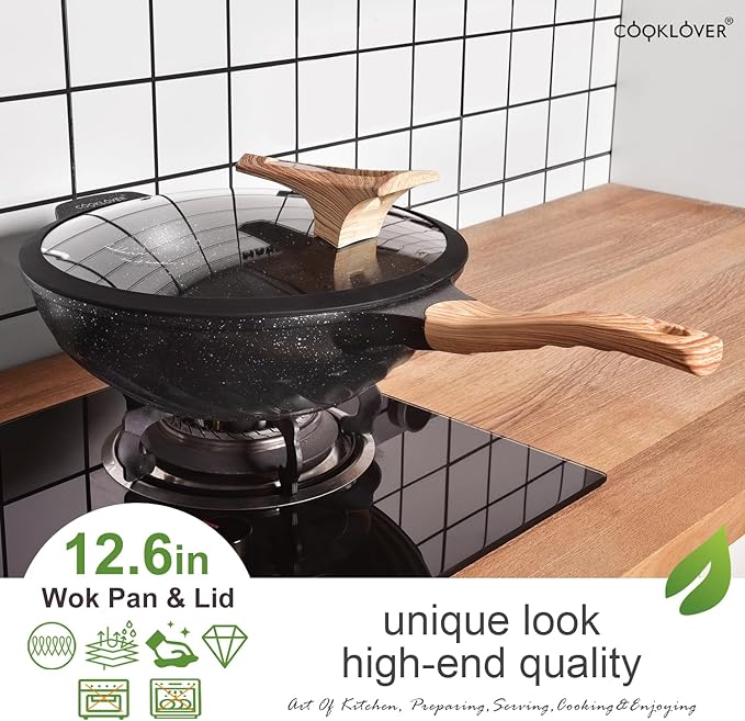 - ✅Ergonomic Bakelite knob and handle: COOKLOVER's wok builds with Eye-catching heat resistant soft touch silicone robust Bakelite knob and handle with beautiful wood grain design (not real wood). Stay cool and comfortable. Easy to maneuver, Safe & Anti-scald.