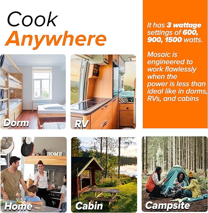 - PERFECT FOR DORMS & RV’S – Mosaic is light-weight and portable. It performs flawlessly in RV’s, dorms, campsites, and smaller apartments. Its 3 wattage settings of 600, 900 & 1500 watts are designed to work well anywhere even when the power is limited.