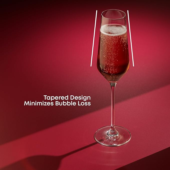 - UNIQUE DRINKING EXPERIENCE: These crystal glasses have an ergonomic design with reinforced stems for added stability, plus uniform rims which provide a comfortable drinking experience. The tapered design of the bulbs is meant to minimize bubble loss, allowing you to enjoy your favorite drink for longer!