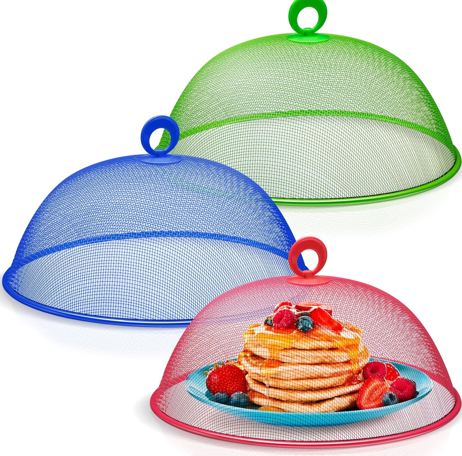 Metal Mesh Screen Food Cover Tent Umbrella, 10.75 inch, Reusable Outdoor Picnic Food Covers Mesh, Food Cover Net Keep Out Flies, Bugs, Mosquitoes (3 Pack, Green Blue Red)