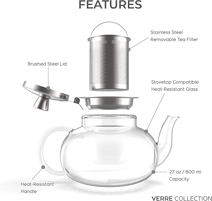 Glass Teapot Stovetop Compatible Kettle with Stainless Steel Removable Infuser, Loose Leaf Tea, Stovetop Safe Tea Pot and Strainer (27 Ounce)