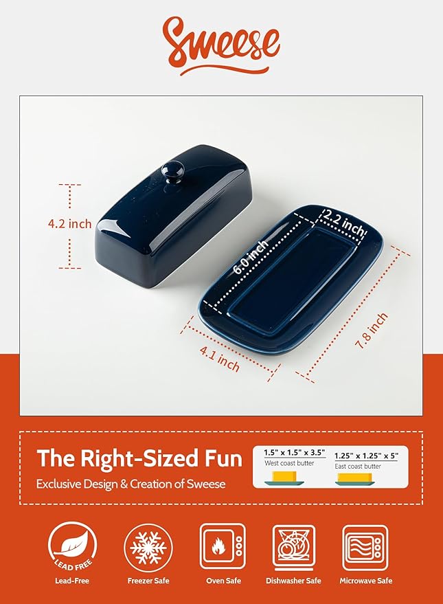 Sweese Butter Dish with Lid, Porcelain Butter Keeper, 7.8 Inch Butter Holder with Handle Cover, Butter Container Perfect for East West Coast Butter, Navy
