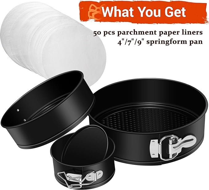 - Springform pan Set includes 4 inches, 7 inches, 9 inches, and 50 PCS parchment paper liners. No additional butter or grease means less fat.