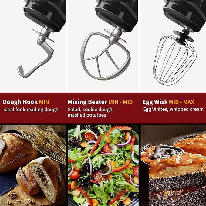 - Powerful Motor - Let Baking with Ease! Stand mixer with a strong motor and sturdy ABS housing, 3 different speed from slow stir to fast mix, make it easy for cakes, breads, cookies, pizza, muffins, waffle, mashed potatoe and more.