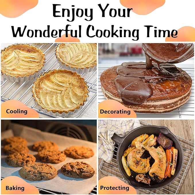 - 【BAKE EVENLY】Roasting rack raised 0.6-inch height, Allowing air to circulate on all sides of the food, Baking evenly for cooking quickly and saving time on repeat roasting, Cooling evenly for uniformly and quickly cool the cookies