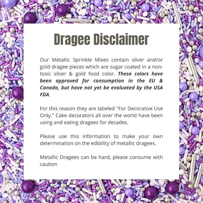 - Metallic Dragees Disclaimer: Silver and gold dragees are commonly used by cake decorators worldwide. While approved for consumption in some regions, they are traditionally labeled as “For Decorative Use Only” in the U.S. Please use discretion when adding them to your creations