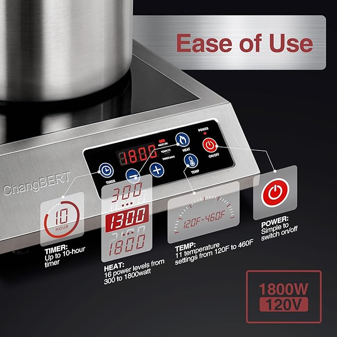 - HIGH EFFICIENCY & 10-HOUR TIMER - ChangBERT induction cooktop (120V, 15A) offers 16 preset power levels (300-1800W) and 11 preset temperature settings (120-460°F). With an 83% energy efficiency rating, this induction cooker is more efficient than traditional gas or electric stoves, providing quick heat-up and faster cooking times. The built-in countdown digital timer, up to 10 hours, meets various cooking requirements.