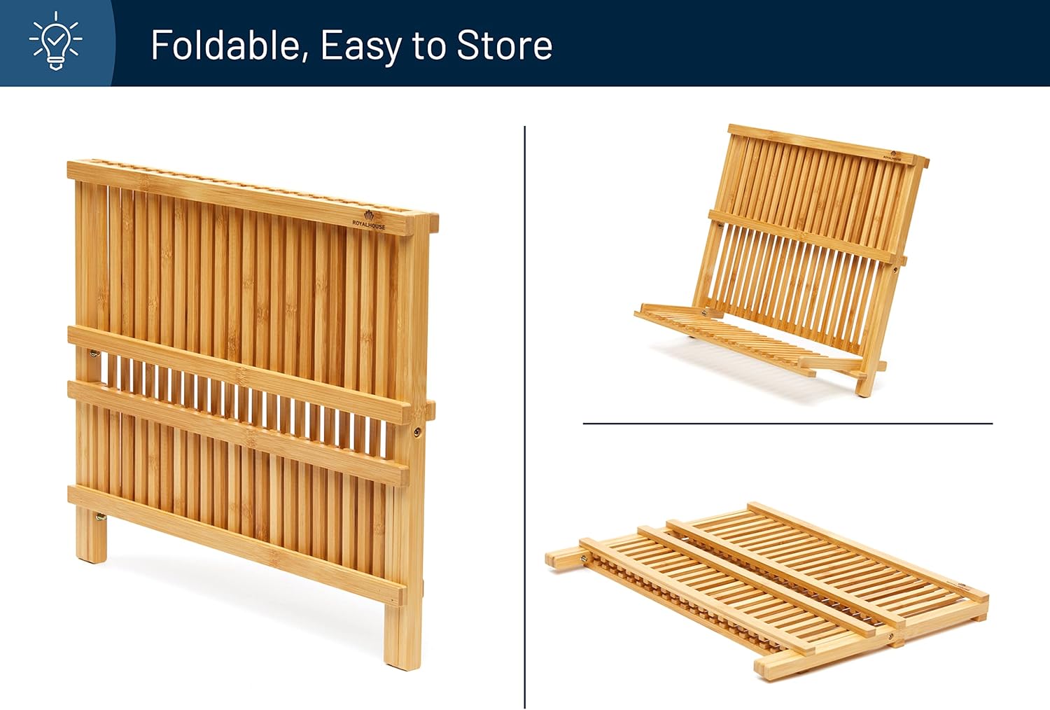 RoyalHouse Premium Natural Bamboo Dish Rack, Collapsible Dish Drainer, Foldable and Compact Dish Drying Rack for Kitchen Counter
