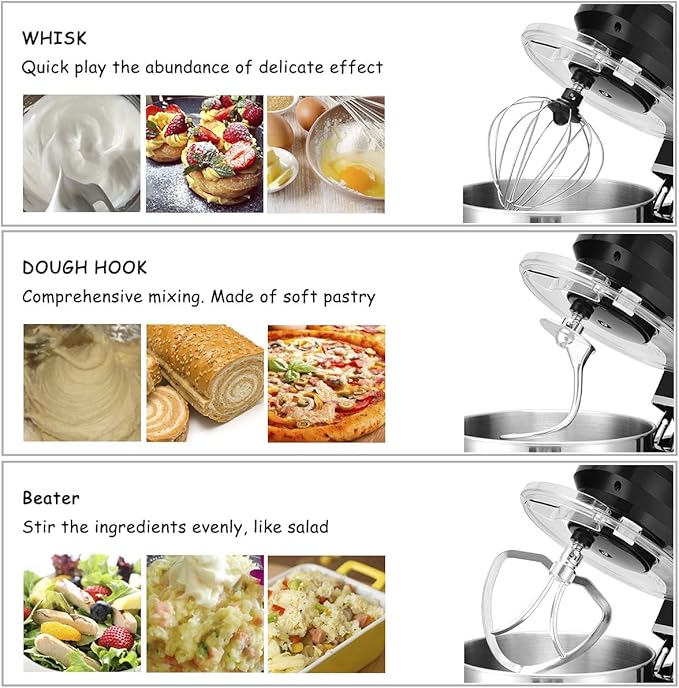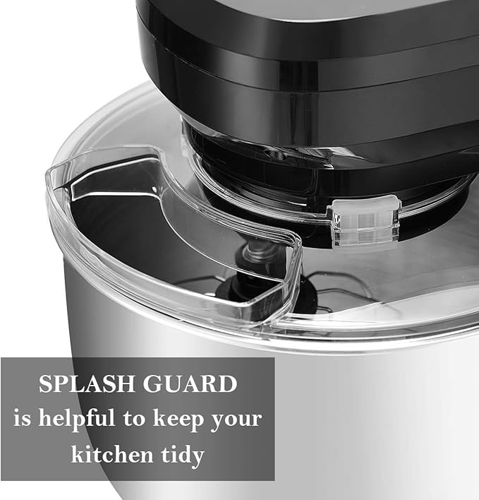 - 【Versatility】It comes with 3 different accessories for all your food preparation needs, such as dough hook, beater and whisk. Equipped with a splash guard helps add ingredients without making a mess.