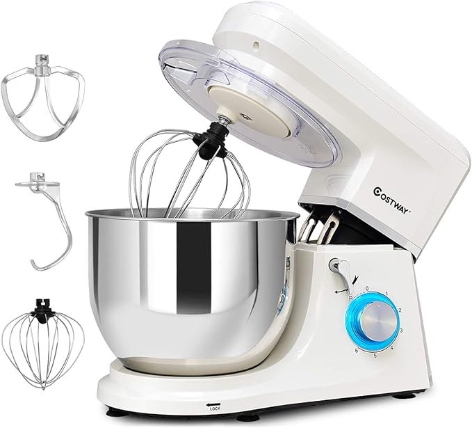 COSTWAY Stand Mixer, 7.5-Quart 660W 6-Speed Electric Mixer with Stainless Steel Bowl, Tilt-head Food Mixer with Dough Hook, Beater, Whisk (White)
