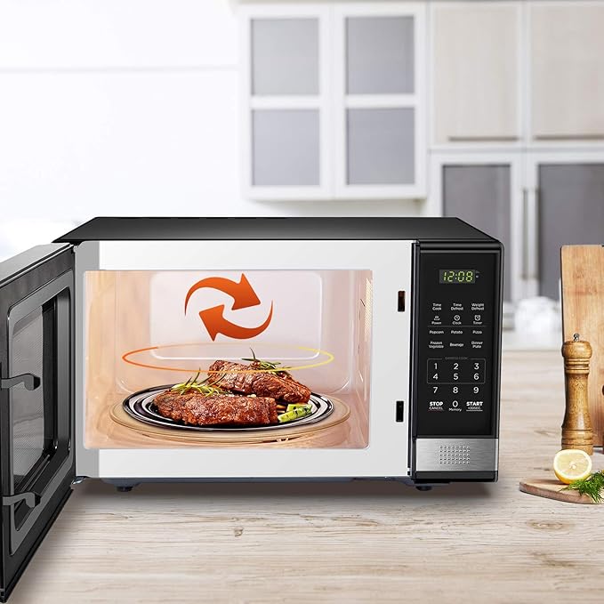 - Large LED digital display, easy-to-read control panel, child safety lock, interior light, removable 12.4β glass turntable