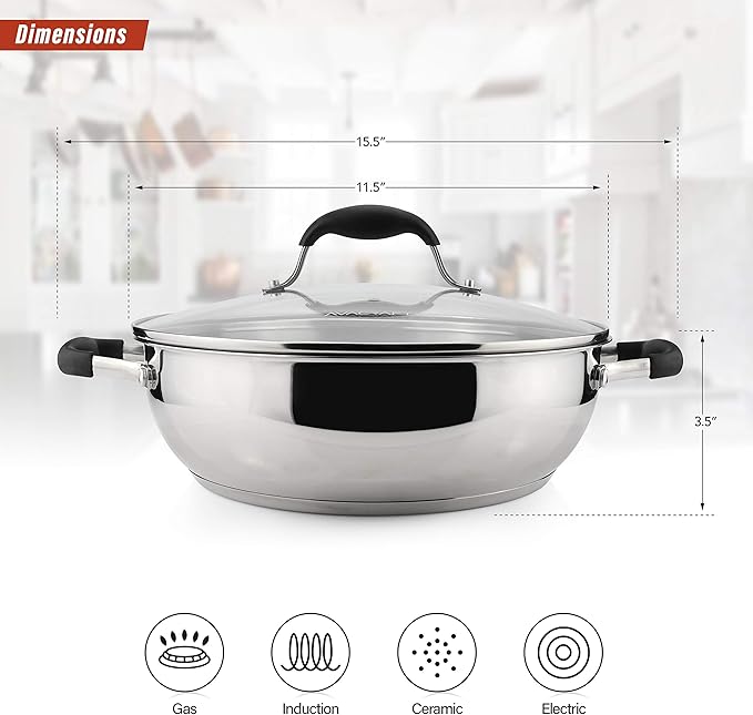 - MULTIPURPOSE PAN: Versatile pan, use it as stir fry pan, stainless steel wok, stainless steel frying pan, sauté pan, stewpot, steak pan, crepe pan, skillet. Works on multiple cooktop types including induction, stove top, gas, electric etc. Induction wok. Healthier option over nonstick pan for every house.