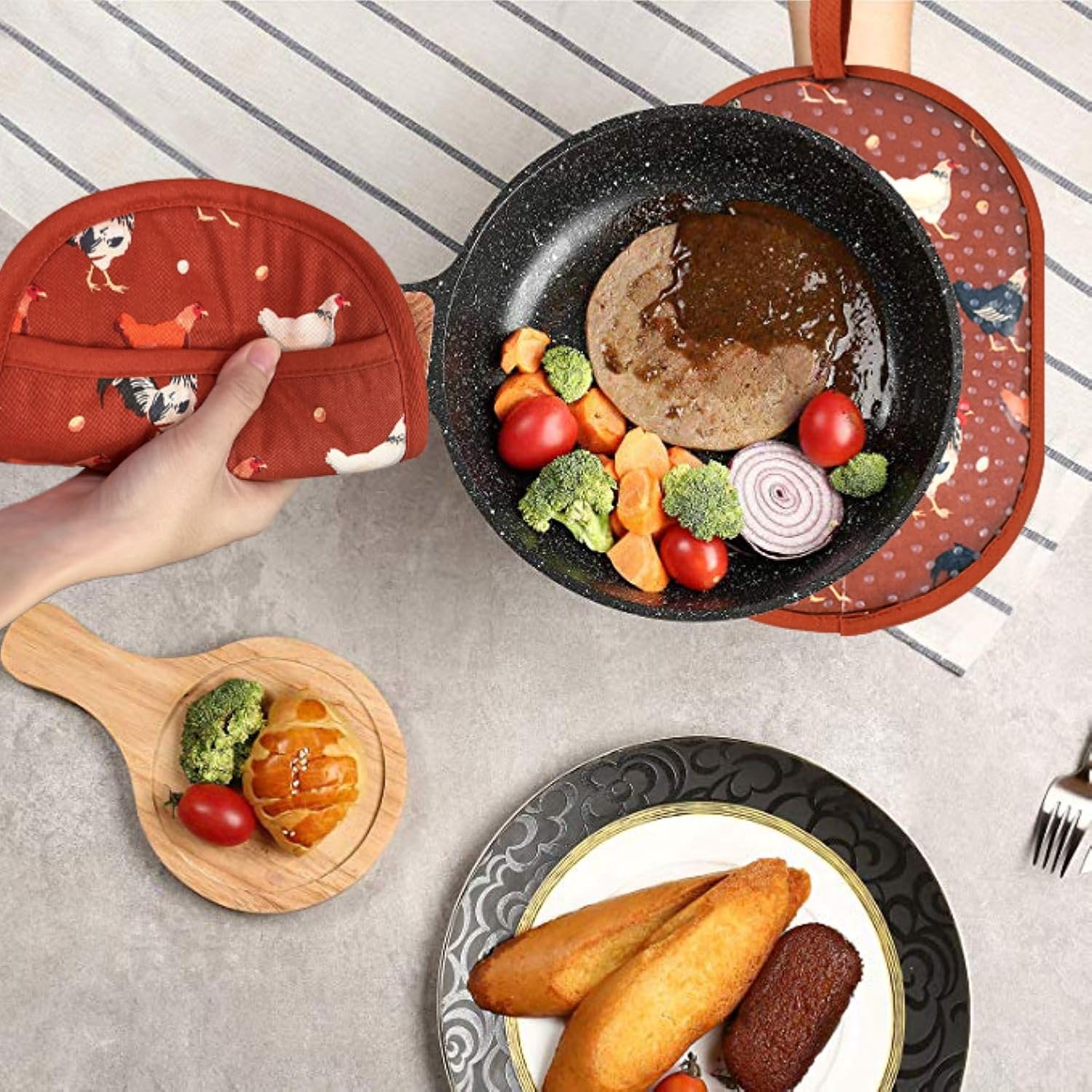- 5. FINE WORKMANSHIP AND DURABLE USE: WORKMANSHIP QUALITY ASSURANCE: Strictly follow the sewing standard of 1-inch 8-9 stitches, which makes fabric and silicone perfectly, durable and smooth combination. Each pot holder will be tested 7 times by QC to make sure high quality.