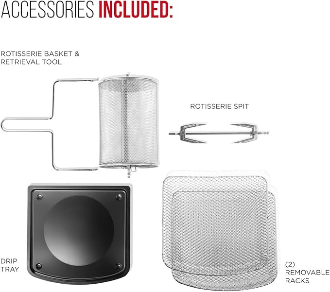 - CONVENIENT ACCESSORIES: Interior lighting allows you to easily watch your food as it cooks. Accessories include 2 air flow racks, rotisserie spit and forks, rotating basket/retrieval tool and drip tray. Removable drip tray and dishwasher safe parts make cleaning a breeze.