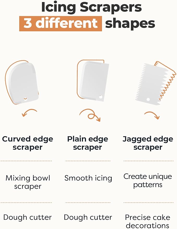 - 3 Edges of Cake Scrapers: This cake decorating set includes 3 different icing comb scrapers, so you can make various designs on your cake. With one rounded scraper, one straight scraper, and one toothed scraper, you can easily create complex and stunning designs.