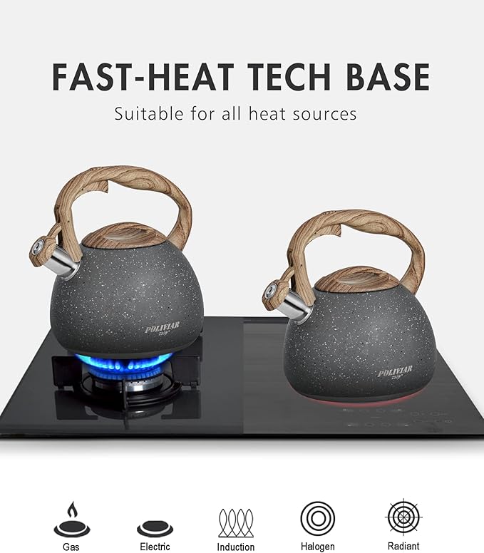 - Fast Heat Base: The tea kettle designed with a generous 8 in base can maximize the heat conduction to increase the efficiency of boiling. High grade stainless steel is suitable for any heat source including gas, electric and induction.