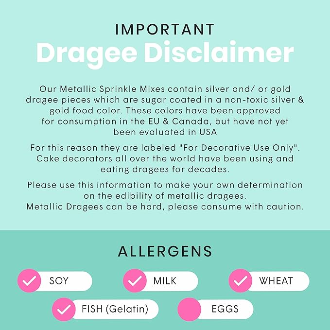 - Metallic Dragees Disclaimer: Silver and gold dragees are commonly used by cake decorators worldwide. While approved for consumption in some regions, they are traditionally labeled as “For Decorative Use Only” in the U.S. Please use discretion when adding them to your creations